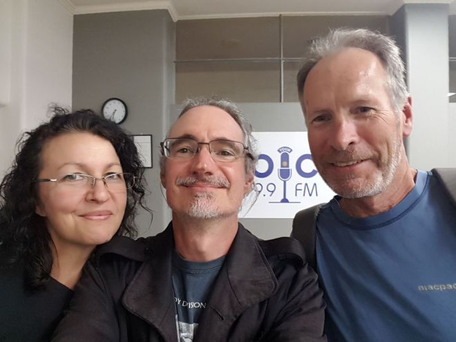 Kirstyn McDermott, Jason Nahrung and Neale Thompson spruiking They Are Us at Voice FM’s The Arts Program.