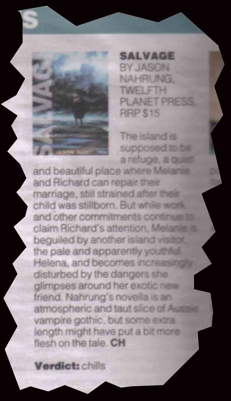 The Herald Sun‘s ‘Weekend’ section ran a review of Salvage on 25 August by Corinna Hente. Grand to see a novella published by a small press getting a run!